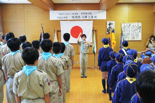 9月2日に吹田第9団の指導者任命式、入隊上進式が、千里第三小学校で行われました。