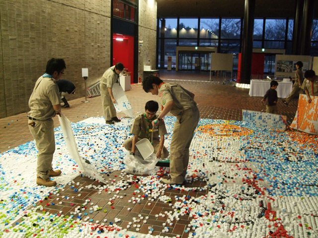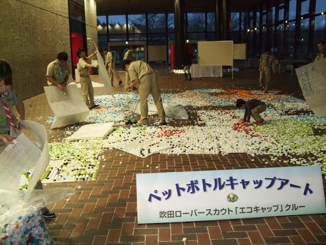昨年5月の地区スカウトデーで制作したエコキャップアート「太陽の塔」を、12月から万博記念公園内EXPO’70パビリオンで展示。