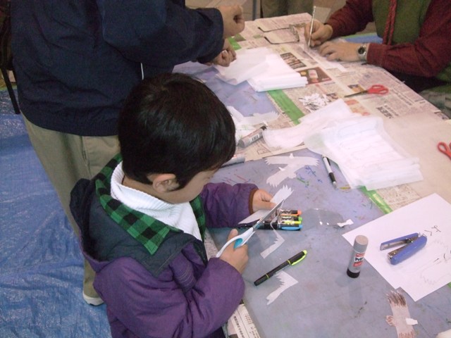 なかなか「やらない?」と声をかけてくれなかったのですが、やっと気づいてもらえて、まずは紙を鳥の型に切ってひらひら飛ばすクラフト。