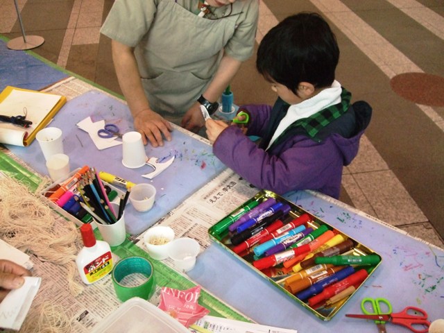 そして紙コップを使ってニワトリの鳴き声を出すクラフト。よくできているクラフトばかりです。子どもも喜んでました。