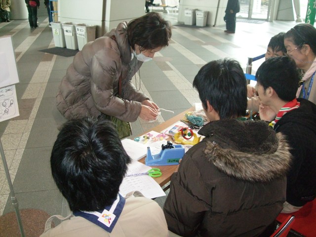 ベンチャースカウトがやっているロープ結び教室。本結びや巻き結び、ひきとけ、もやいなどを教えてもらっていました。