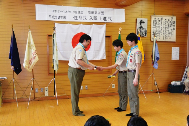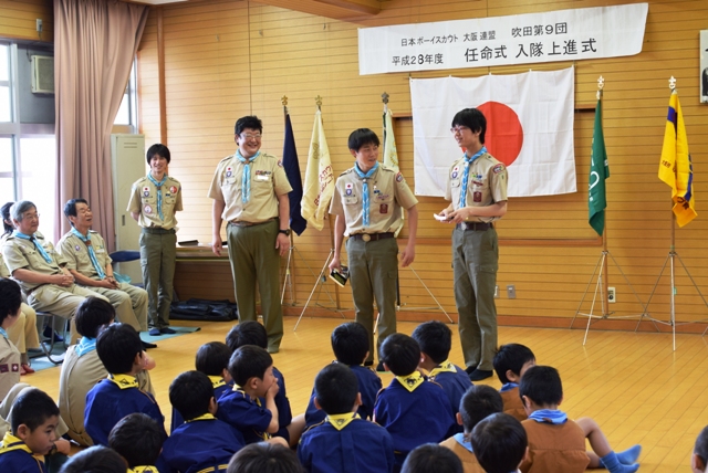 4月10日(日)、吹田第9団の「平成28年度 任命式・入隊上進式」が、千里第三小学校にて行われました。